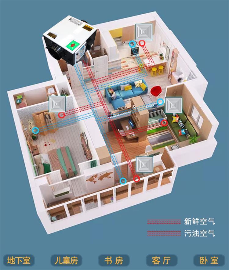 單向流新風(fēng)系統(tǒng)在運(yùn)行時(shí),室內(nèi)廢氣有組織的不斷排至室外,這時(shí)就會(huì)產(chǎn)生氣壓不平衡,使室內(nèi)產(chǎn)生負(fù)壓,新鮮空氣通過進(jìn)風(fēng)口進(jìn)行過濾、除濕、除味、降噪后,二十四小時(shí)源源不斷的補(bǔ)充進(jìn)來。在單向流住宅新風(fēng)系統(tǒng)中,次臥室利用走廊和次臥室門下裝修縫作為新風(fēng)走道,不需要額外的投資。
